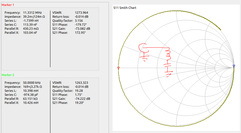 which looks absolutely perfect - 0 resistance at 11Mhz. Since the tank circuit is disconnected from the main circuit I took the liberty of probing the drain of the FET without the tank circuit attached and got the exact same measurement - so I guess what is happening here is the input choke is forming a tank with the FET capacitance.