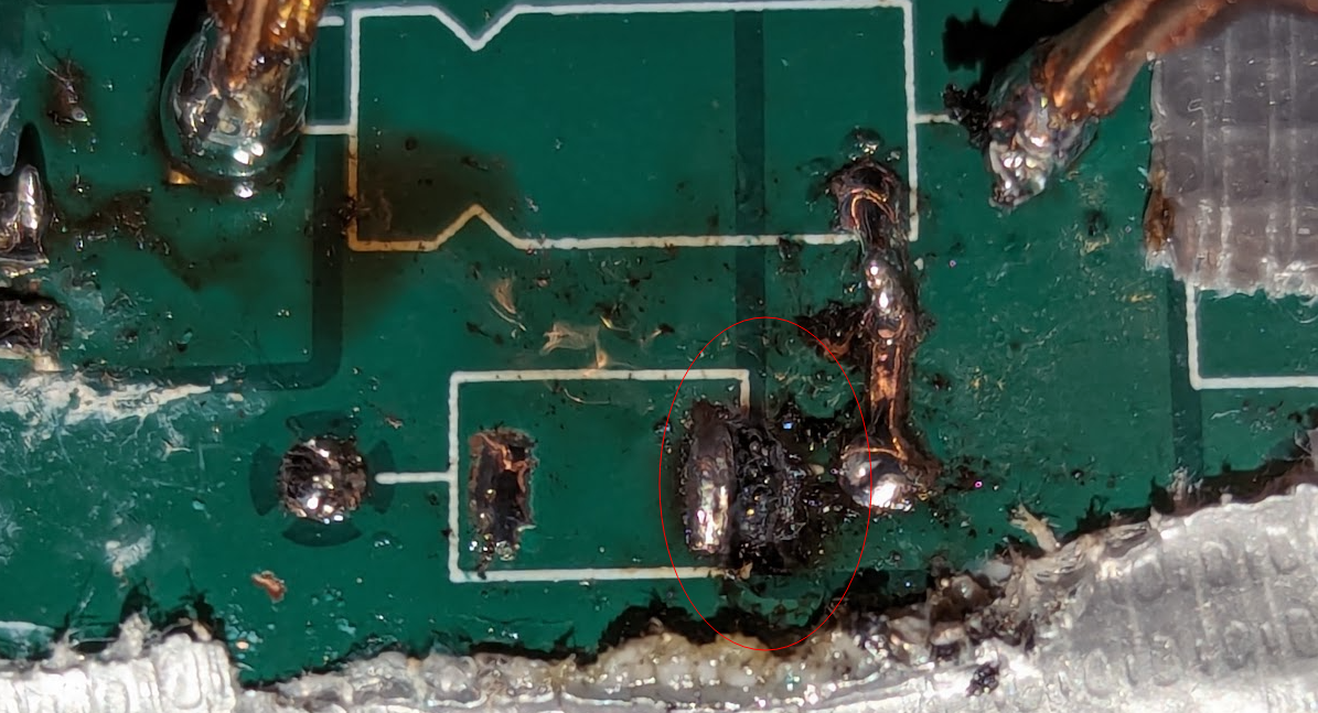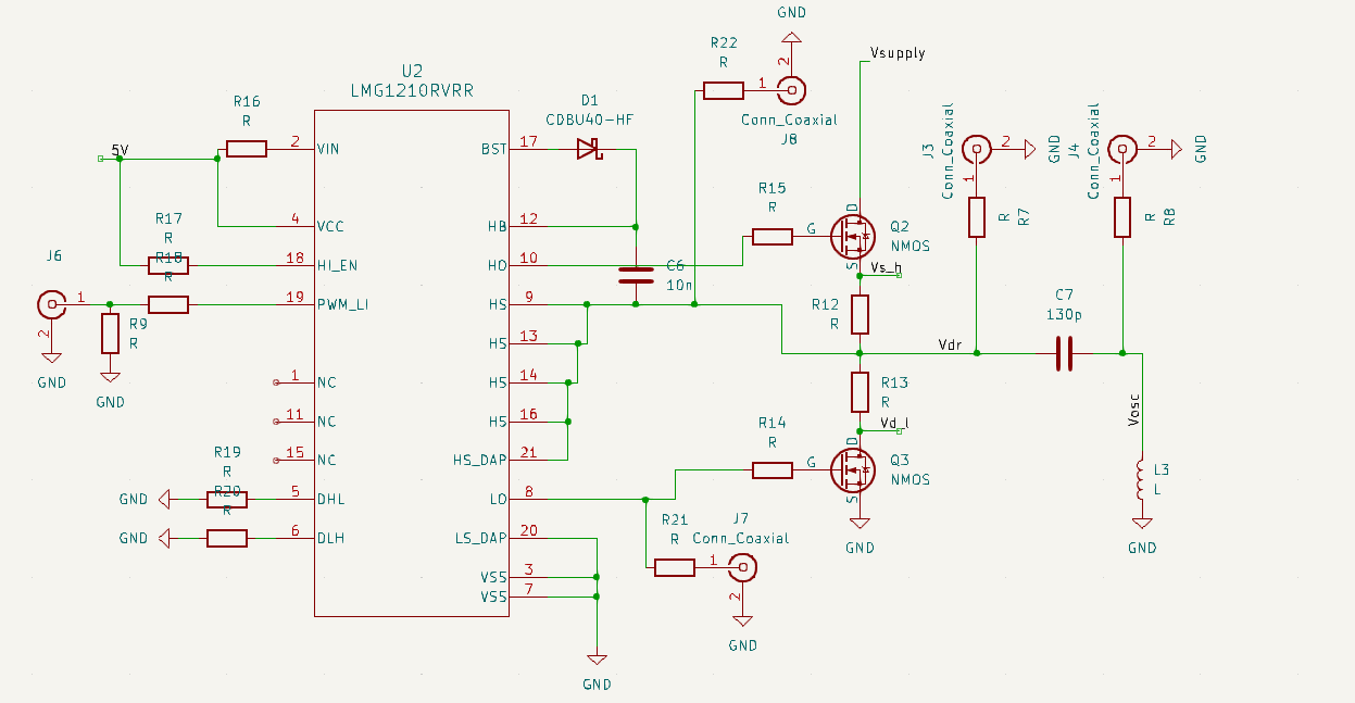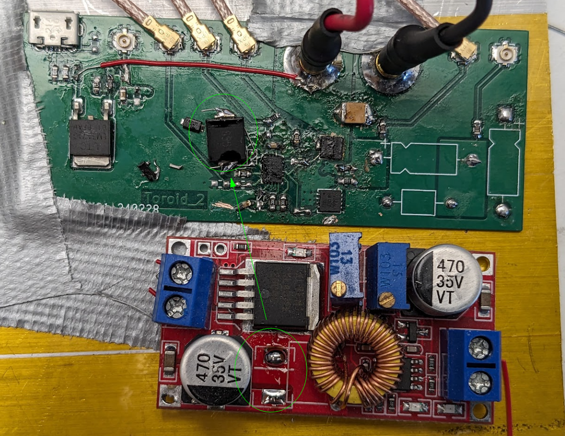 aaand it died. once I changed the resistors r12 and R13 that limited the current from power to ground, it worked for a little bit and then died, killing the top FET and the LMG1210. I resoldered new ones on and replaced the resistors with 1.4R resistors, which will hopefully act like fuses. I also changed the bootstrap cap: