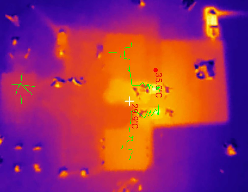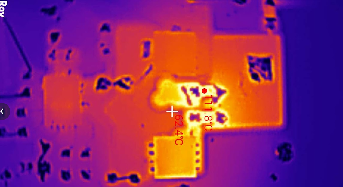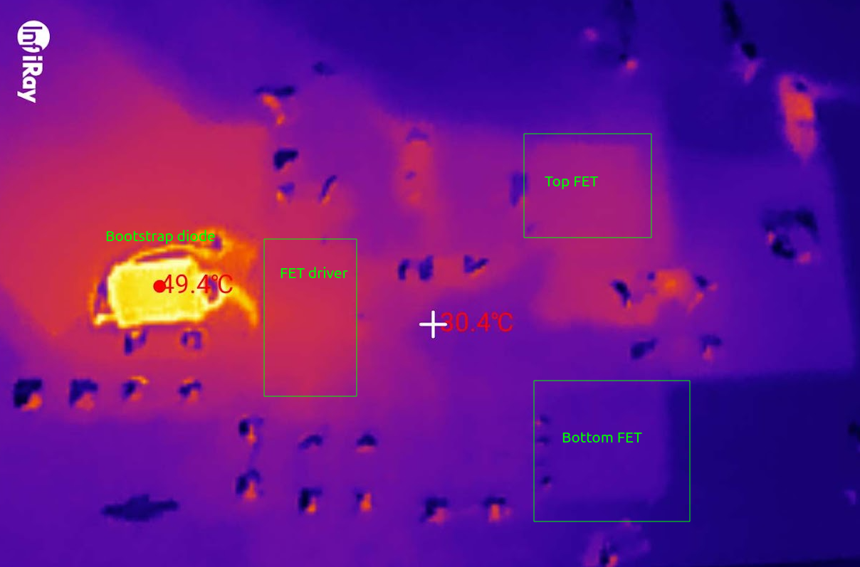 So clearly it actually is the gate voltage that is sagging here. I noticed also on the thermal camera that the bootstrap diode was getting a workout in: