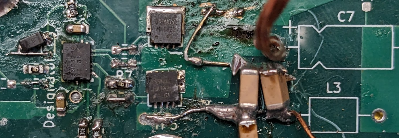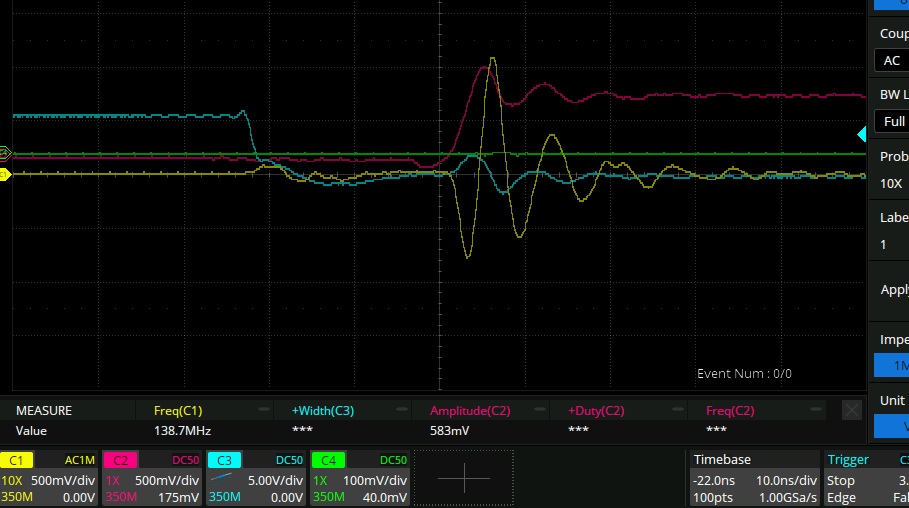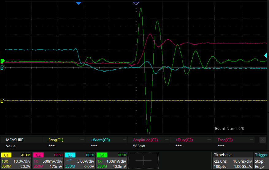 Previously I measured 2 volts peak to peak across a <5mm long piece of wire, and decided that this was a result of “bad decoupling” and “inductance” and that I should “decrease my current loops” and “make sure the MLCC is placed close to the half bridge”. Well, I did all that: