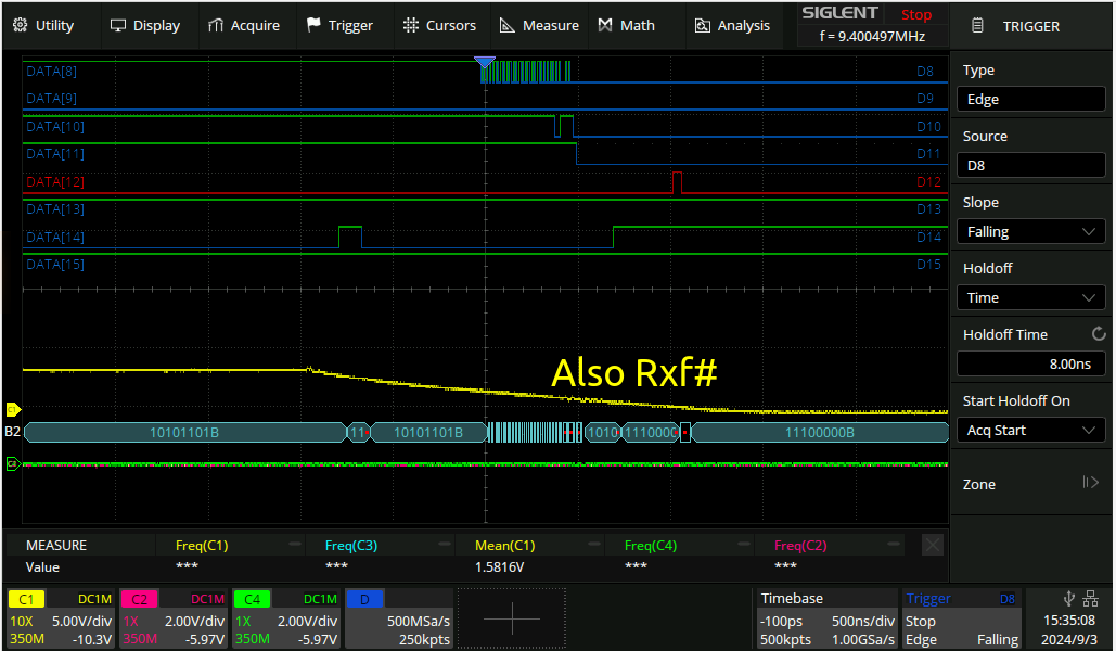 above logic analyzer signals are in the same order as the official ftdi screenshot. Looks like rxf# is going low rather slowly.