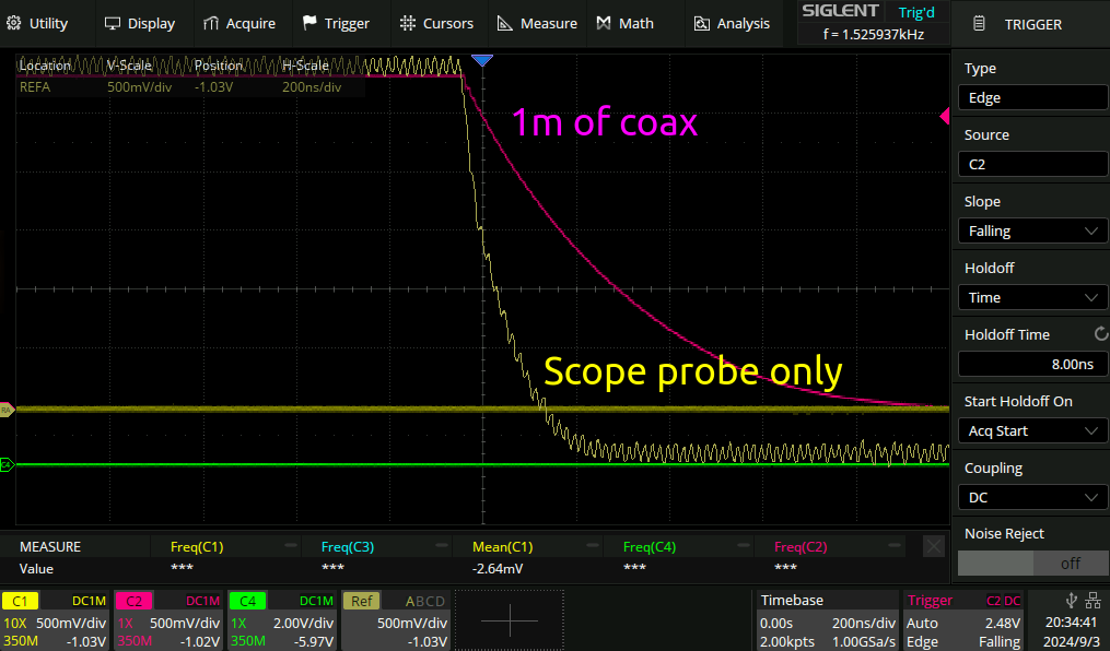 This is with 1kR resistors. So to meet the 10MHz spec they would need to be 1/2 of what they are to go from 200ns fall time to 100ns.