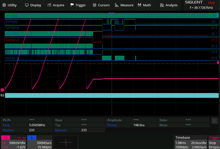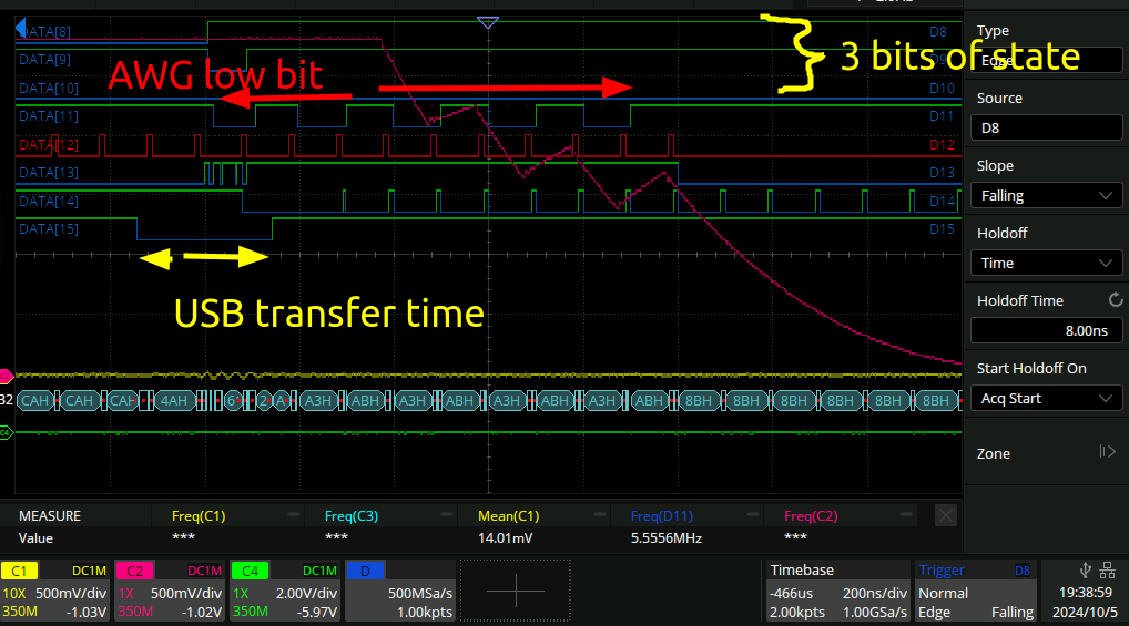 That in turn says there is data available. But ftdi_fsm_valid goes low for a good long while during which the awg output is flat. It goes high again after that and some stuff happens but I think that’s the chook running around with its head off at that point.