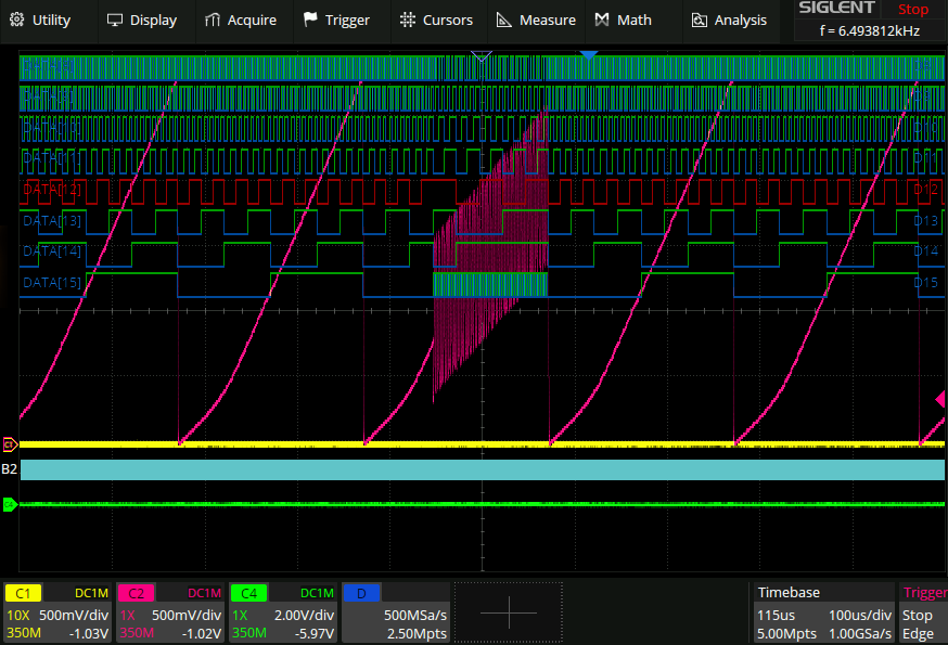 Here is the r2r dac working properly finally. I have a ramp, the falling edge of which can be seen here: