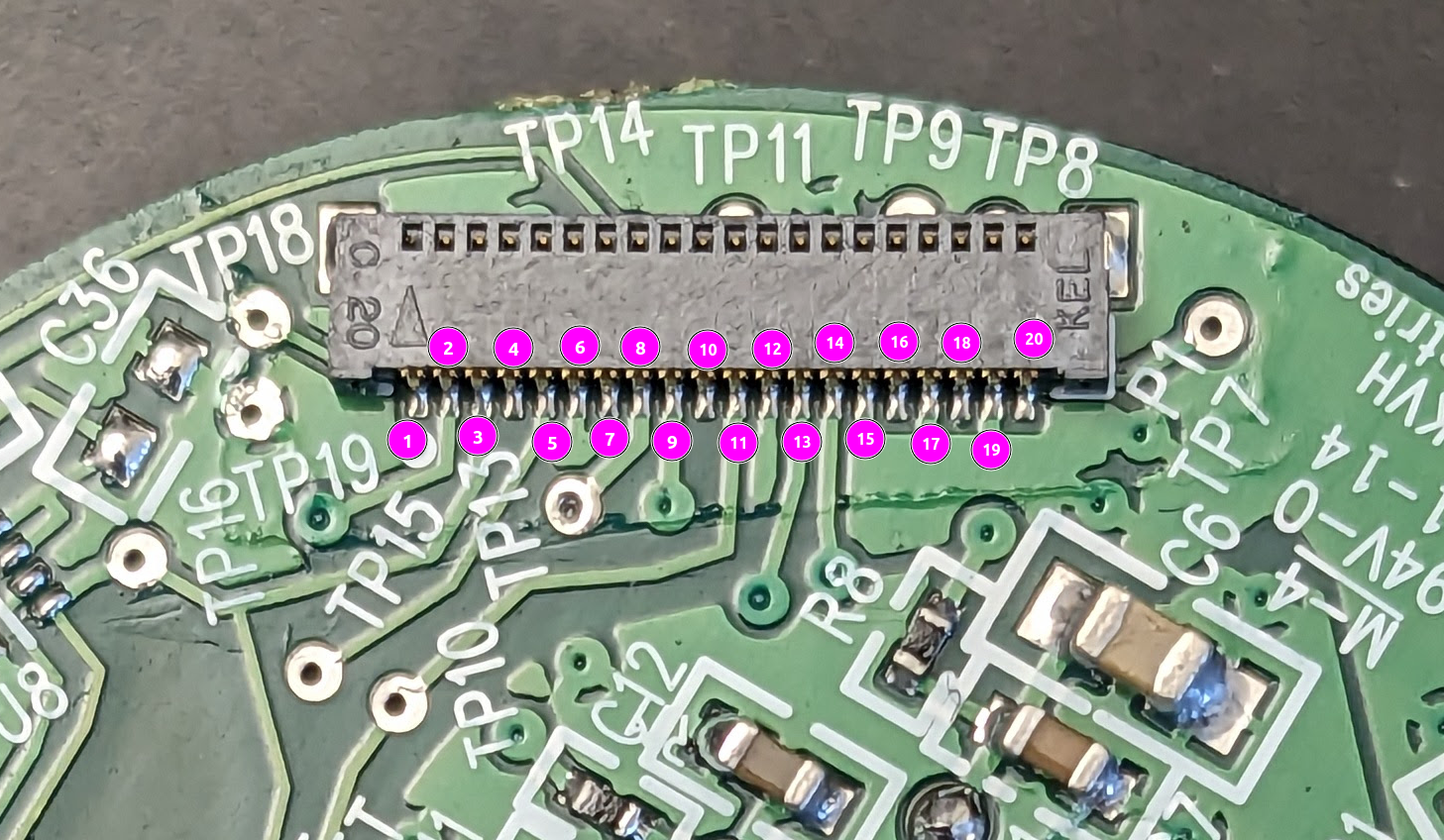 This has three connections to the fiber system. There are two through hole connectors that I can see on the fiber board, a 5 pin one in a ring, and a weird 2 pin one that seems to have no voltage on it at all (this is in agreement with the below observations on the DAC input being flat, though).