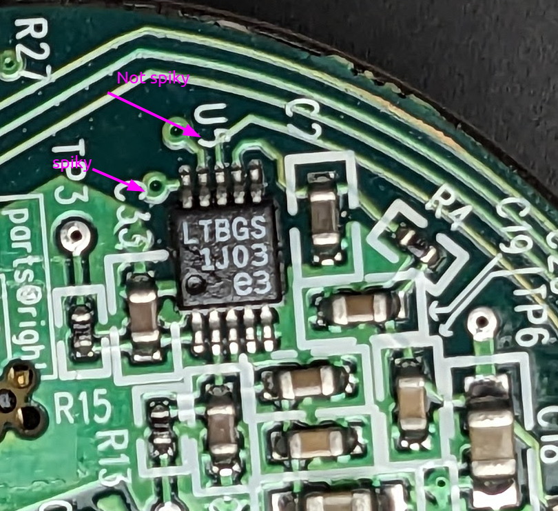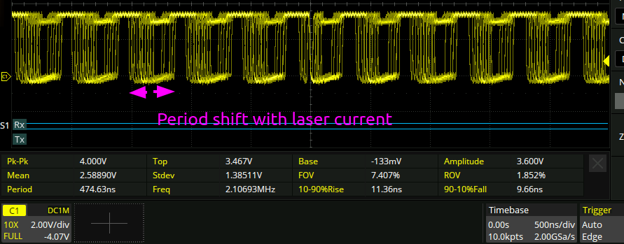 The measured laser current however seems to be changing a few times per second from around 23 to 53mA. That seems wack. But, lo! I also found this test point on the fiber gyro board: