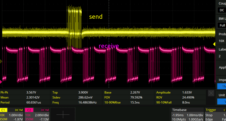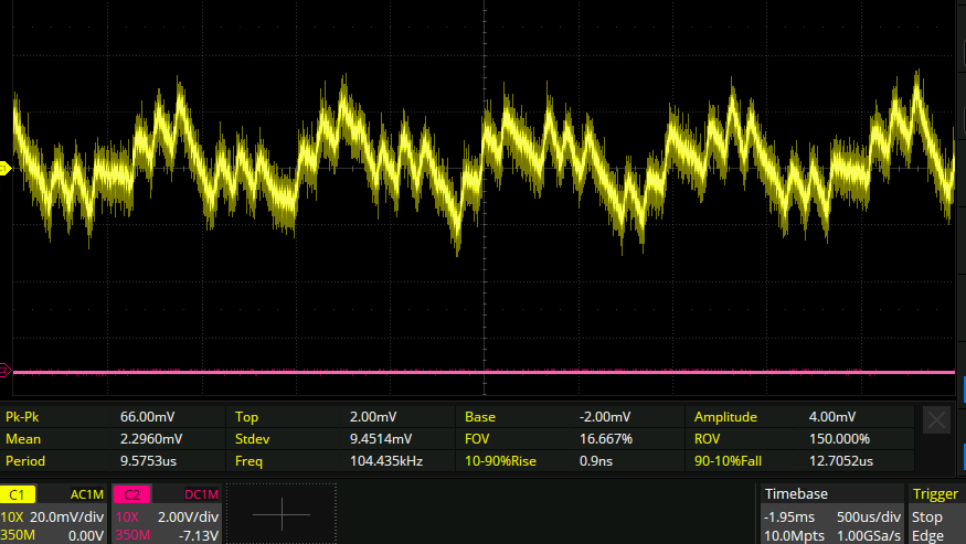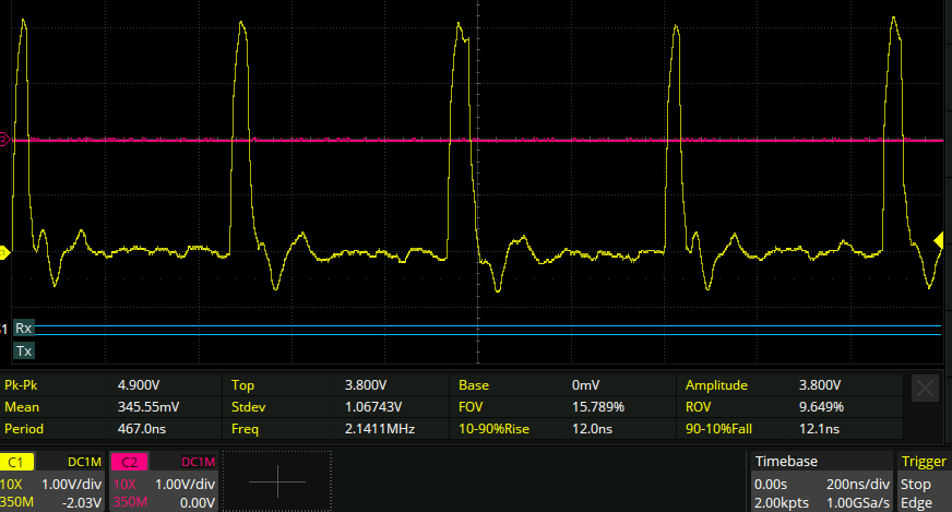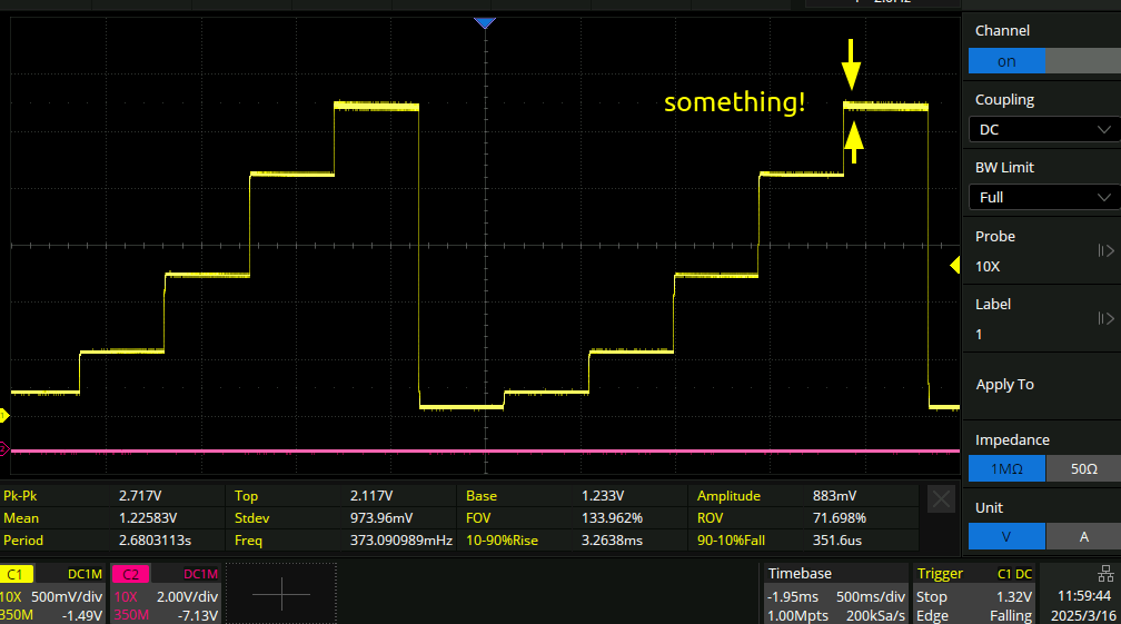 It would appear that I was looking at the CONV/SCK/SDO lines. The CONV line is the spiky one above. This means that when the duty cycle was changing above, that was the magnitude of the digital signal changing, not the frequency of an analog one. Kind of weird because when I probe pins 1 and 2 of the chip with the probe AC coupled and zoomed in to 5mv/div, I see basically no change whatsoever on the input. The chip also does not have an internal amplifier, so it’s not just that it’s too low for the scope to measure.
