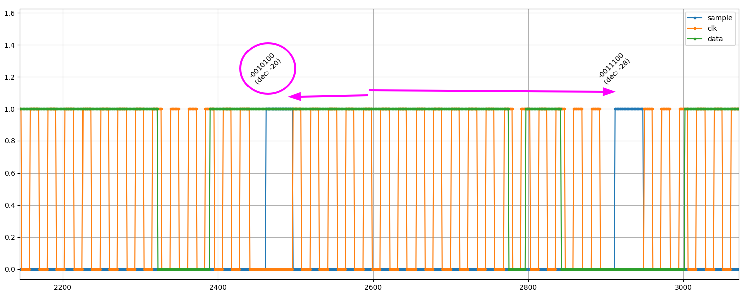 So the next step is to take a reading of the digital signals, which will require probing the CLK+SDO lines concurrently. Probably the CONV line would help, too.