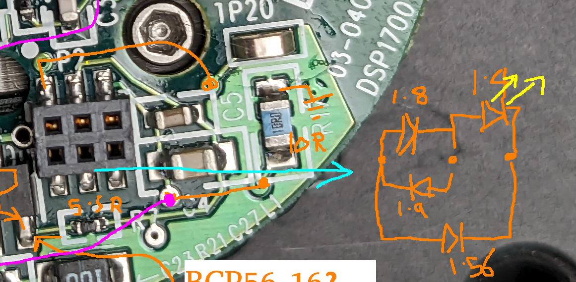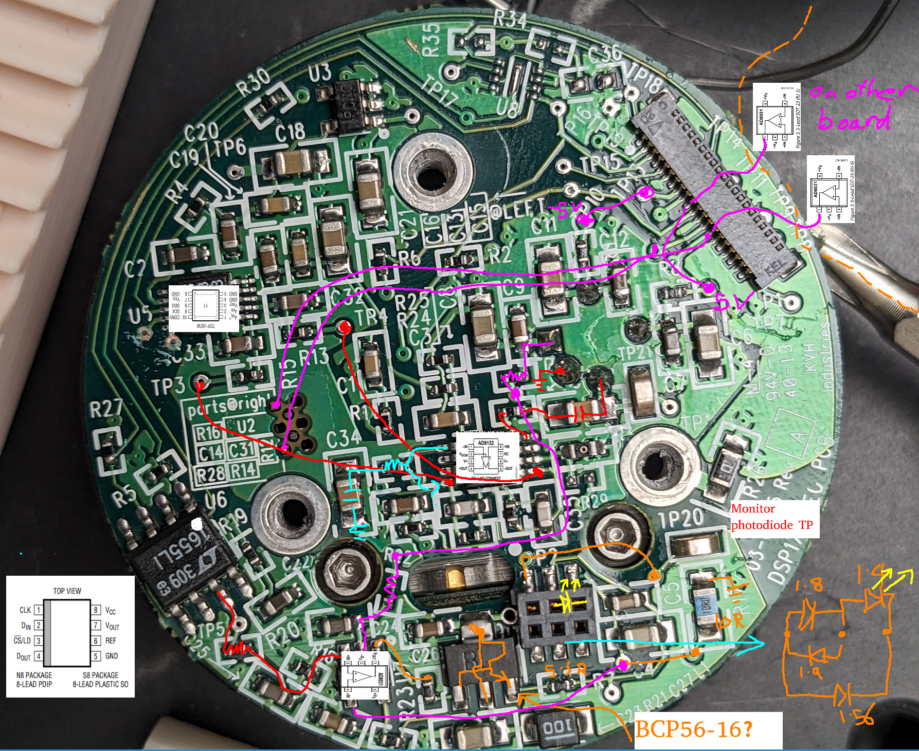 The three pin connector that goes to the laser package has a bewildering array of diode drops measurable, even when only the package is being measured (it’s not connected to the rest of the circuit). Presumably the three pin package is a laser diode + monitor photodiode package. But there are no less than 4 different diodes measurable between the three terminals, so it’s not clear which is which