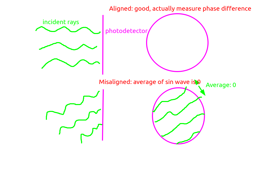 A fiber optic gyro is an interferometric device. In an interferometer, the whole surface of the photodiode must be normal to the rays being interfered with, otherwise fringes will form and the photodiode will measure the average of the signal across many sin wave periods, which is 0.