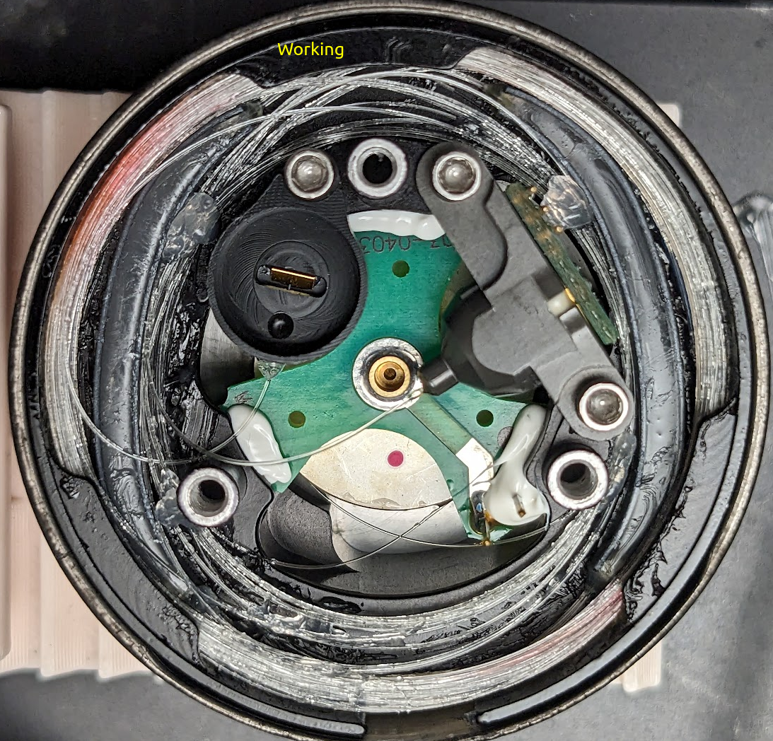 The gyro that works has light clearly coming out of the mirror. The one that doesn’t, doesn’t. I can see that there is light coming out of the laser as it leaks out the bottom of the package. however there is absolutely zilch coming out of all other areas. I think this is the root cause of the issue this particular gyro has. Light is clearly coming out of the laser, and not coming out of the fiber that’s supposed to go to the photodiode. Not much I can do about that.