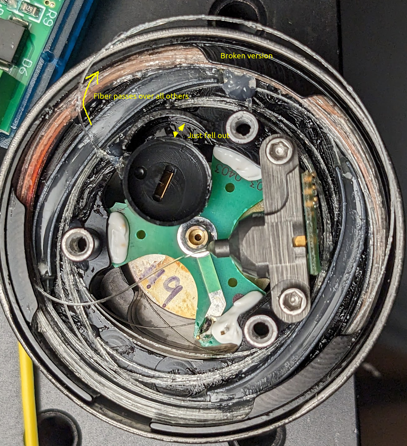 The broken ones mirror isn’t bolted down and is flapping in the breeze! And there isn’t even a way to bolt it down either! This makes no sense at all. In addition to being a different hardware revision this one has also been assembled differently, the fiber for this one passes over the others and has a tendency to pop out of the casing. The previous one had the fiber coming out of the mirror pass under some others and was much better controlled. For posterity, the ‘A’ gyro is the one that works.