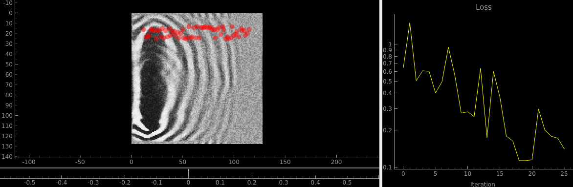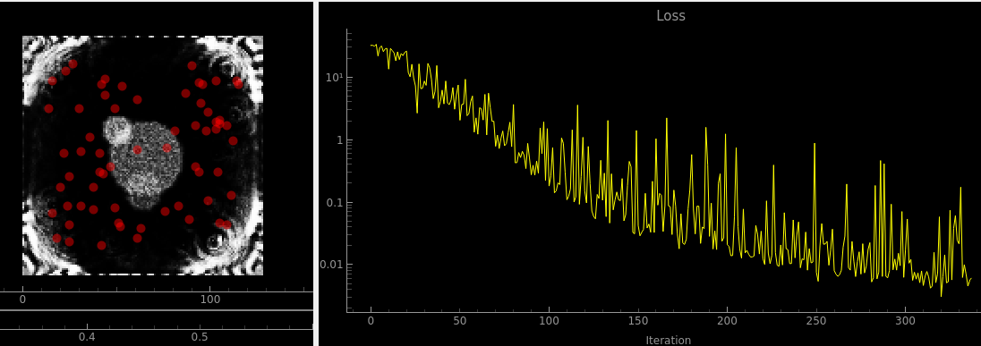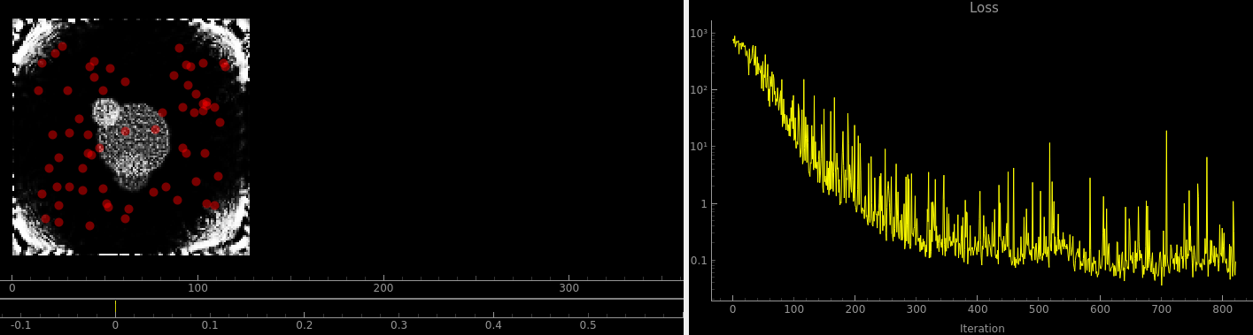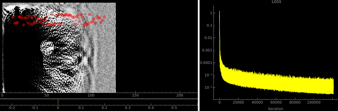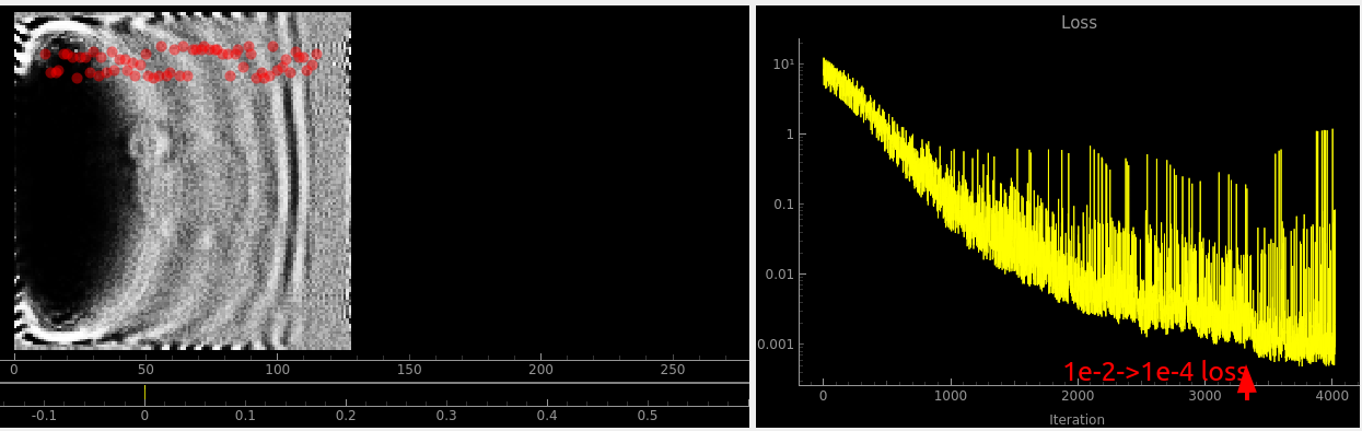 You can actually just barely see the correct answer hiding here. but again the loss function is horrific. The loss is bouncing up and down by 3 OOM per iteration, surely it doesn’t have to do that. And it’s not like the image on the left changes in appearance a lot between iterations.