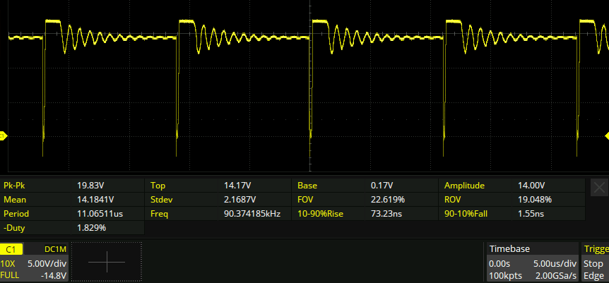 so it’s a pretty standard boost circuit with some current feedback. Here is the drain of the MOSFET of my circuit, which has failed somehow and is only outputting about a volt higher than the input voltage: