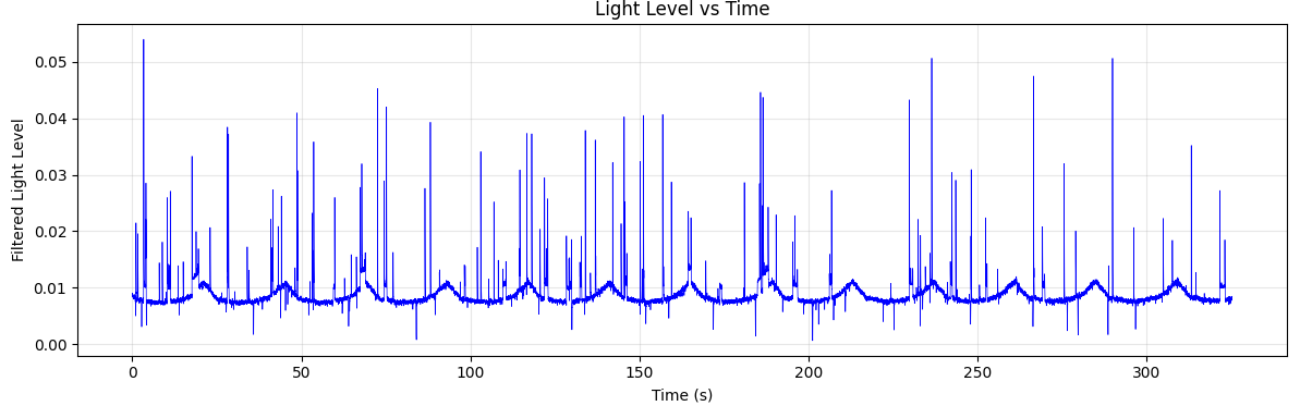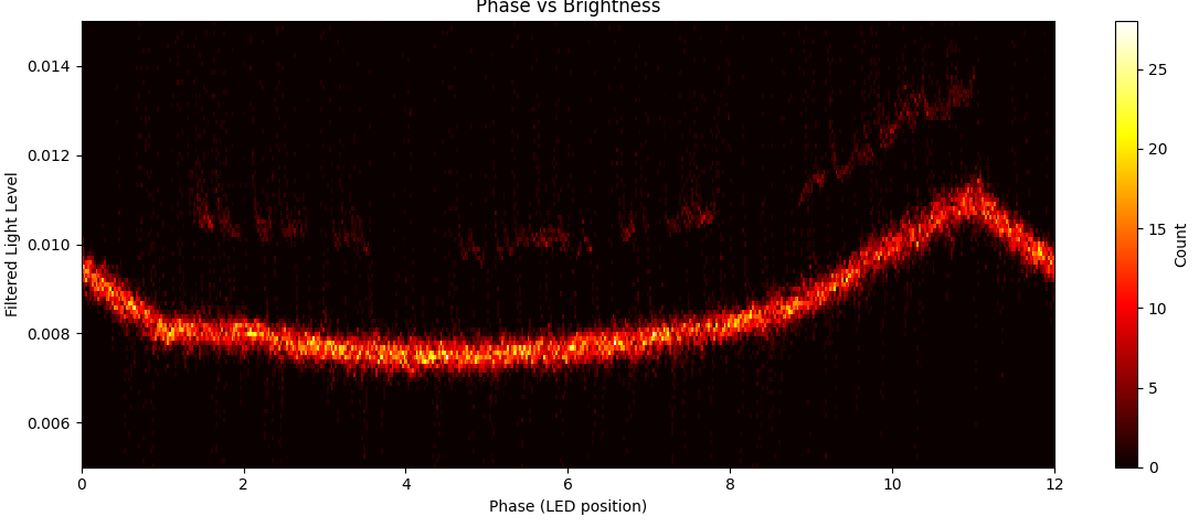 To my eye, the interpolation between adjacent LED bars was not perfect, there was some variation in brightness. Fortunately since we have an ambient light sensor this is easy to measure by just putting the PCB in a box. This results in these plots: